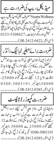 Private Company Islamabad, rawalpindi Islamabad Pakistan invites applications from eligible candidates for the post of bike rider, helper, composer, typist and medical rep as per advertisement of December 16, 2024 published in daily Jang Newspaper. Preferred Education is Intermediate, Middle, Matric, Bachelor and BA etc.