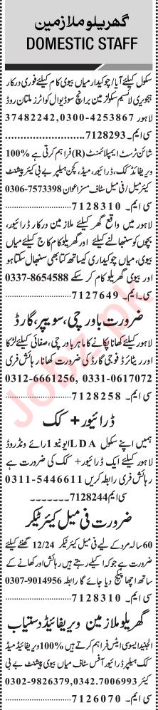 House Lahore, lahore Punjab Pakistan invites applications from eligible candidates for the post of baby care, cook, husband wife, maid, patient care, sweeper, kitchen helper, care taker, driver, chowkidar, aya and guard as per advertisement of January 16, 2023 published in daily Jang Newspaper. Candidates with Primary, Middle and Matric etc. educational background will be preferred.