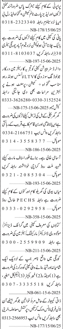Private Company invites applications for job positions advertised in daily Jang dated 16 June 2025 for following vacancies in Tariq Road Karachi, karachi Sindh Pakistan.