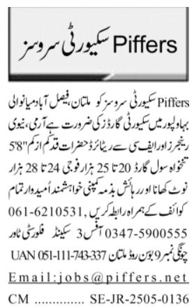Vacant posts including fauji guard, security guard, security staff and civil guard are announced in Piffers Security Services Pvt Ltd Bosan Road Multan, faisalabad, mianwali, bahawalpur and multan Punjab Pakistan as per 16 June 2025 advertisement in daily Jang Newspaper. Educational qualifications required Intermediate and Matric etc.