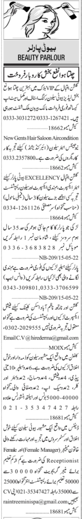 Jang Sunday Classified Ads 15 May 2022 for Beauty Parlor