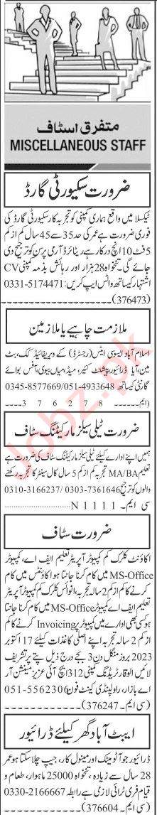 Private Company is looking for candidates for following posts as per job advertisement published in daily Jang Newspaper of October 16, 2023 for location Islamabad, rawalpindi, taxila and abbottabad Islamabad Pakistan: