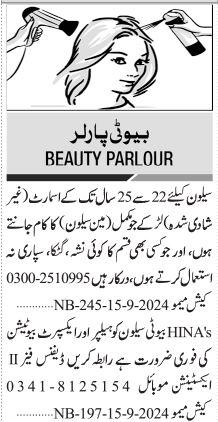 Beauty Parlor is looking for candidates for following posts as per job advertisement published in daily Jang Newspaper of September 16, 2024 for location Karachi, karachi Sindh Pakistan: