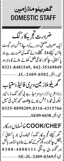 Jang Sunday Classified Ads 15 Sep 2024 For Domestic Staff