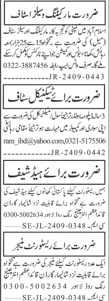 Private Company Islamabad, lahore Islamabad Pakistan invites applications from eligible candidates for the post of mechanical diploma holder, sales staff, marketing staff, technical staff, head chef and restaurant manager as per advertisement of September 16, 2024 published in daily Jang Newspaper. Intermediate, BA, DAE, Bachelor, Middle and Matric etc. educational qualification will be preferred.