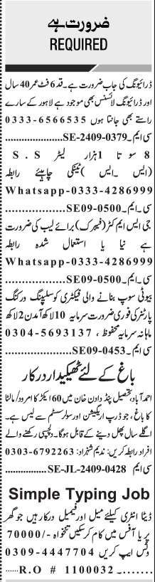 Private Company Lahore, lahore Punjab Pakistan invites applications from eligible candidates for the post of data entry operator, typist, working partner, driver, contractor and ltv driver as per advertisement of September 16, 2024 published in daily Jang Newspaper. Educational qualifications required Intermediate, Bachelor, Middle and Matric etc.