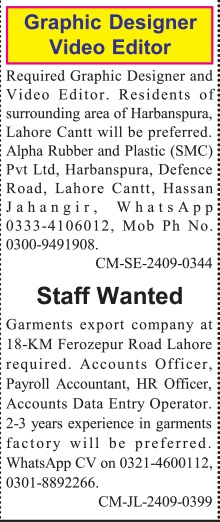 Private Company jobs advertisement dated about 16 September 2024 in daily Jang Newspaper invites application for the vacant post of hr officer, payroll accountant, video editor, accounts officer, data entry operator and graphic designer in Lahore, lahore Punjab Pakistan. BBA, ACCA, Intermediate, B.com and Bachelor etc. educational qualification will be preferred.