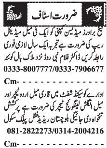 Private Company is looking for candidates for following posts as per job advertisement published in daily Jang Newspaper of September 16, 2024 for location Quetta, quetta Balochistan Pakistan:
