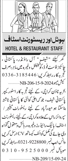 Jang Sunday Classified Ads 15 Sep 2024 For Restaurant Staff