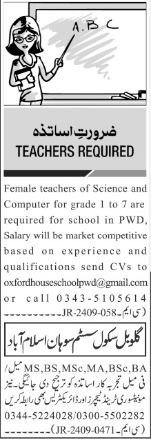 Private School jobs advertisement dated about 16 September 2024 in daily Jang Newspaper invites application for the vacant post of montessori teacher, teacher, montessori directress, computer operator and female teacher in Islamabad, islamabad Islamabad Pakistan. BA, Master, M.sc, MS, MA and Bachelor etc. educational qualification will be preferred.