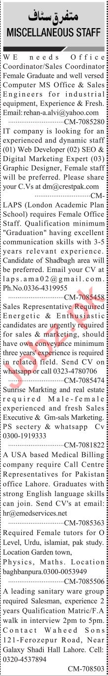 Jang Sunday Classified Ads 16 Aug 2020 For Admin Staff