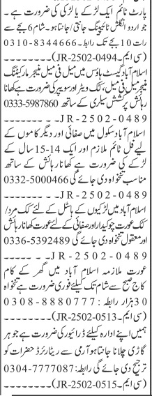 Vacant posts including female office staff, waiter, office staff, cleaner, cook, aya, house maid, chowkidar, sweeper, masi, manager manager, ltv driver, typist and driver are announced in Private Company Islamabad, islamabad Islamabad Pakistan as per 17 February 2025 advertisement in daily Jang Newspaper. Persons with Bachelor, Middle, Intermediate, BA and Matric etc. education can apply.
