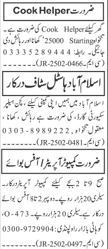 Private Company jobs advertisement dated about 17 February 2025 in daily Jang Newspaper invites application for the vacant post of kitchen helper, security guard, computer operator, hostel staff, office boy and cook helper in Kohati Bazar Rawalpindi, islamabad Punjab Pakistan. Educational qualifications required Bachelor, BA, Matric, Middle and Intermediate etc.