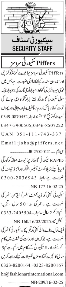 Jang Sunday Classified Ads 16 Feb 2025 for Security Staff