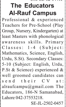 Vacant posts including pakistan studies teacher, nursery teacher, teacher, social studies teacher, kindergarten teacher, english teacher, mathematics teacher, playgroup teacher, science teacher, lady teacher, preschool teacher and urdu teacher are announced in The Educators Samanabad Lahore, lahore Punjab Pakistan as per 16 February 2025 advertisement in daily Jang Newspaper. Candidates with Master, Intermediate, BA, Bachelor, M.sc and MA etc. educational background will be preferred.