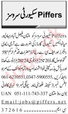 Vacant posts including army guard, security guard and civil guard are announced in Piffers Security Services Pvt Ltd Multan, faisalabad, bahawalpur and mianwali Punjab Pakistan as per 17 July 2023 advertisement in daily Jang Newspaper. Educational qualifications required Matric, Intermediate and Middle etc.