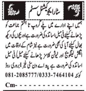 Private School is looking for candidates for following posts as per job advertisement published in daily Jang Newspaper of March 17, 2025 for location Bawrery Road Quetta, quetta Balochistan Pakistan: