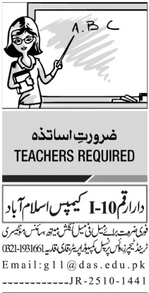 Dar e Arqam Schools Pakistan I-10 Islamabad, islamabad Islamabad Pakistan invites applications from eligible candidates for the post of female teacher, science teacher, teacher, qaria, maths teacher, english teacher, vice principal, qari, computer operator and montessori trained teacher as per advertisement of November 17, 2025 published in daily Jang Newspaper. Candidates with Bachelor, MA, M.sc, BA, Others, Intermediate and Master etc. educational background will be preferred.