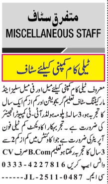 Telecom Company Lahore, lahore Punjab Pakistan invites applications from eligible candidates for the post of marketing staff, computer teacher, telephone operator, diploma holder, sales staff and accountant as per advertisement of November 17, 2025 published in daily Jang Newspaper. Educational qualifications required DAE, Intermediate, B.com and Bachelor etc.