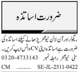 Private School invites applications for job positions advertised in daily Jang dated 17 November 2025 for following vacancies in Multan, multan Punjab Pakistan.