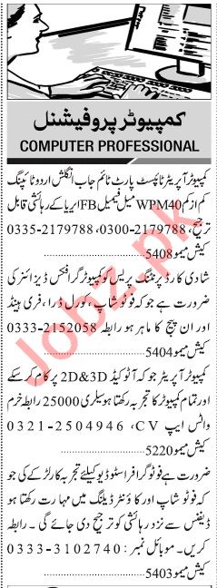 Jang Sunday Classified Ads 16th June 2019 for Computer Staff