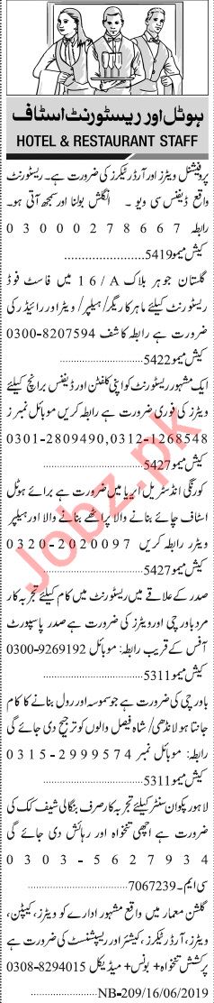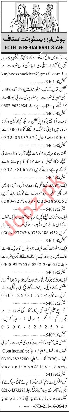 Jang Sunday Classified Ads 16th June 2019 for Hotel Staff