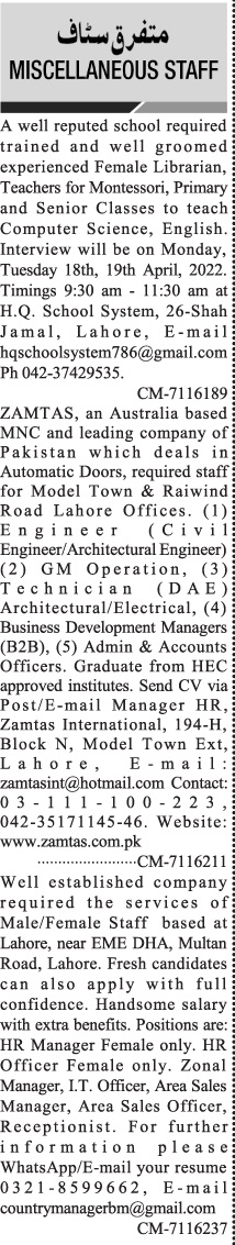 Private Company is looking for candidates for following posts as per job advertisement published in daily Jang Newspaper of April 18, 2022 for location Lahore, lahore Punjab Pakistan: