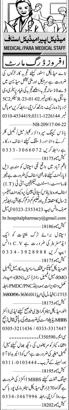 Hospital Clinic Karachi, karachi Sindh Pakistan invites applications from eligible candidates for the post of sales officer, lady doctor, female helper, nurse, mbbs doctor, cleaner, administrator, house keeping supervisor, salesman, supply chain officer, rmo, resident medical officer, warehouse officer, doctor, procurement officer, pharmacist assistant, it staff, technician and radiologist as per advertisement of April 18, 2022 published in daily Jang Newspaper. Persons with Matric, MBBS, Others, Bachelor and Intermediate etc. education can apply.