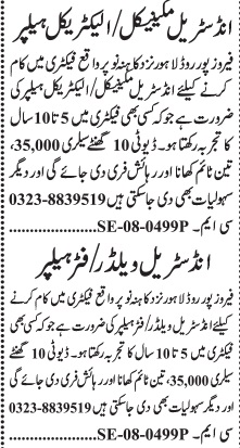 Vacant posts including industrial welder, mechanical helper, electrical helper and fitter helper are announced in Private Industry Kahna Lahore, lahore Punjab Pakistan as per 18 August 2025 advertisement in daily Jang Newspaper. Matric, Intermediate and Middle etc. educational qualification will be preferred.