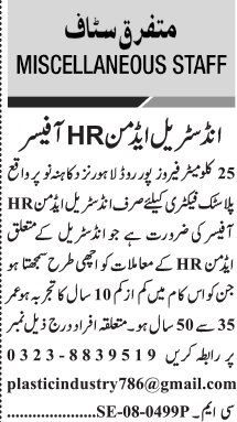Plastic Industry jobs advertisement dated about 18 August 2025 in daily Jang Newspaper invites application for the vacant post of hr officer and admin officer in Kahna Nau Market Lahore, lahore Punjab Pakistan. Persons with Others, Intermediate, Bachelor and BA etc. education can apply.