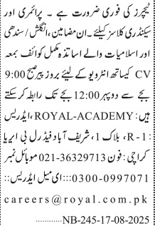 Royal Academy Federal B Area Karachi, karachi Sindh Pakistan invites applications from eligible candidates for the post of islamiat teacher, teacher, sindhi teacher, english teacher, secondary teacher and primary teacher as per advertisement of August 18, 2025 published in daily Jang Newspaper. Preferred Education is Bachelor and Master etc.