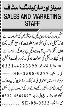 Marketing Company Marghzar Officers Colony Lahore, lahore Punjab Pakistan invites applications from eligible candidates for the post of field worker, sales staff, salesman and marketing staff as per advertisement of August 18, 2025 published in daily Jang Newspaper. Matric, Middle and Intermediate etc. educational qualification will be preferred.