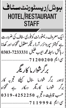 Restaurant Lahore, lahore Punjab Pakistan invites applications from eligible candidates for the post of shawarma maker, cook, order taker, cashier, supervisor and chef as per advertisement of July 18, 2022 published in daily Jang Newspaper. Persons with Middle, Intermediate, Matric and Bachelor etc. education can apply.