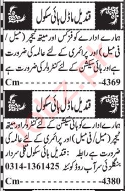 Qandeel High School is looking for candidates for following posts as per job advertisement published in daily Jang Newspaper of March 18, 2024 for location Quetta, quetta Balochistan Pakistan: