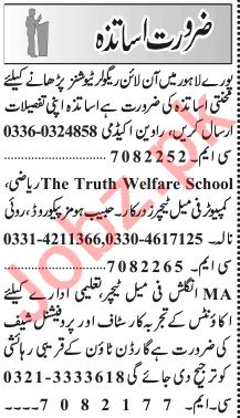 Teacher, Quran Teacher, English Teacher, Chemistry Teacher, Physics Teacher, Coordinator, Biology Teacher, Maths Teacher, Urdu Teacher, Art Teacher, ESL Teacher, High School Teacher, History Teacher, Kindergarten Teacher, Middle School Teacher needs in well known schools.