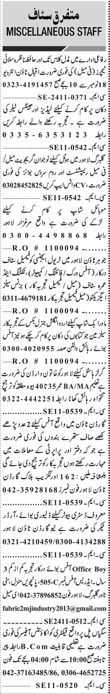 Vacant posts including ladies tailor, delivery boy, gents tailor, nazra teacher, qari, salesman, warden, teacher, room service boy, sales executive, shop helper, female warden, receptionist, ticketing officer, hafiza, tailor, order taker, computer operator, accounts officer and office staff are announced in Private Company Lahore, lahore Punjab Pakistan as per 18 November 2024 advertisement in daily Jang Newspaper. Preferred Education is B.com, MA, Middle, BA, Matric, Bachelor and Intermediate etc.
