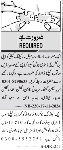 Vacant posts including distributor and dealer are announced in Distribution Company Karachi, karachi Sindh Pakistan as per 17 November 2024 advertisement in daily Jang Newspaper. Educational qualifications required Matric and Intermediate etc.