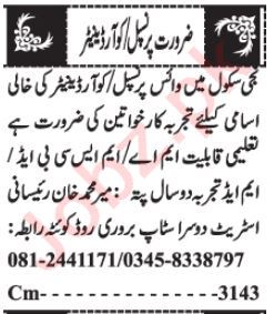 Vacant posts including vice principal and coordinator are announced in Private School Quetta, quetta Balochistan Pakistan as per 18 September 2023 advertisement in daily Jang Newspaper. Persons with B.ed, MA, Master, M.ed and M.sc etc. education can apply.