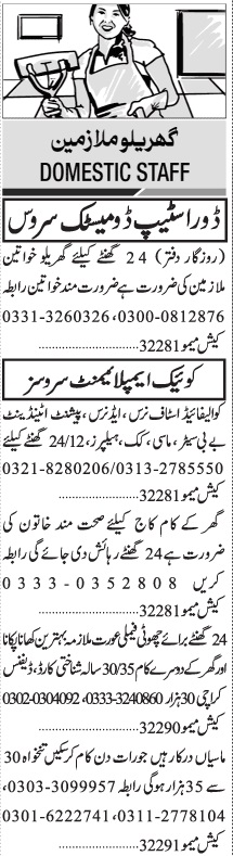 Vacant posts including helper, masi, cook, house maid, nurse, maid, aid nurse, house servant, baby sitter, house worker, staff nurse and patient attendant are announced in House Karachi, karachi Sindh Pakistan as per 18 August 2024 advertisement in daily Jang Newspaper. Persons with Primary, Matric and Middle etc. education can apply.