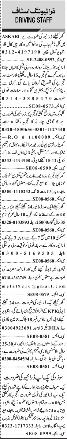 Private Company jobs advertisement dated about 18 August 2024 in daily Jang Newspaper invites application for the vacant post of driver, house driver, ltv driver, car driver and pickup driver in Lahore, lahore Punjab Pakistan. Persons with Middle and Matric etc. education can apply.