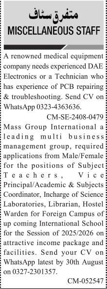 Latest Classifieds jobs in Private Company in Human Resource and others can be applied till 3 September 2024 or as per closing date in newspaper ad. Read complete ad online to know how to apply on latest Private Company job opportunities. Learn today skills like Teaching/Lecturing, Business Management and Electronics to apply confidently on these Private Company jobs.