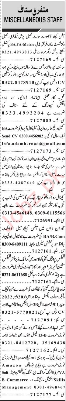 Private Company jobs advertisement dated about 19 December 2022 in daily Jang Newspaper invites application for the vacant post of gun man, call operator, salesman, panaflex machine operator, graphic designer, helper, trainer, tailor, office boy, receptionist, driver, personal secretary, site supervisor, composer and accountant in Lahore, lahore Punjab Pakistan. Educational qualifications required Matric, Bachelor, Middle and Intermediate etc.