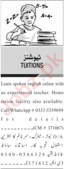 Jang Sunday Classified Ads 18 June 2023 For Home Tutor