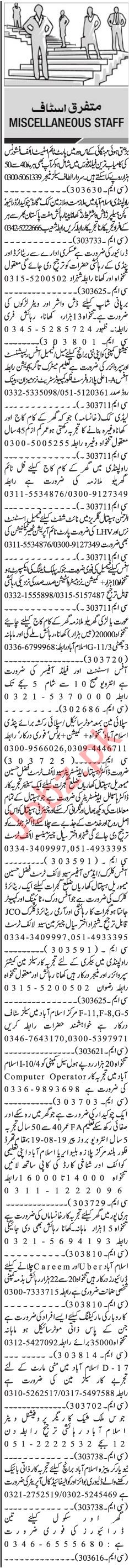 Salesman, Insurance Agent, Sales Officer, Cook, Security Guard, Watchman, Driver, Kitchen Helper, Dish Washer, Loader, Waiter, Receptionist, Supervisor, Chef, Maid, Assistant Nurse, LHV, OT Technician, Public Dealing Expert, Office Assistant, Field Officer, Supply Man, Doctor, Hospital Administrator, Clerk, Admin Officer, Data Entry Operator, Cashier, Manager, Sales Staff, Computer Operator, Careem Driver, Uber Driver, Marketing Staff, Delivery Boy, Call Operator, Office Assistant, Hotel Manager, Sweeper, Recovery Officer, Pharmacist, Welder, Electrician needs in well reputed companies.