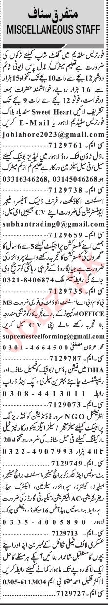 Private Company jobs advertisement dated about 20 February 2023 in daily Jang Newspaper invites application for the vacant post of sales manager, front desk officer, ac electrician, electric head, office staff, manager administration, sales executive, branch manager, security guard, cashier, telemarketing officer, assistant accountant, sales staff, helper, receptionist, assistant manager branch manager, supervisor, salesman and insurance agent in Lahore, lahore Punjab Pakistan. Persons with Intermediate, Matric, Bachelor and Middle etc. education can apply.