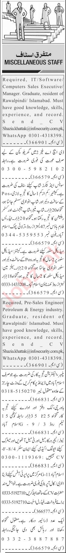Private Company jobs advertisement dated about 20 February 2023 in daily Jang Newspaper invites application for the vacant post of sales manager, pre sales engineer, driver, kitchen helper, sales executive, data entry operator, teacher, ltv driver, shop manager, electrician, cook, tutor, house worker, call operator, cro, plumber, petroleum engineer, salesman, software engineer, cashier, it expert and customer relation officer in Rawalpindi, islamabad Punjab Pakistan. Intermediate, Bachelor, Matric and Middle etc. educational qualification will be preferred.