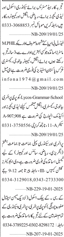 Jang Sunday Classified Ads 19 Jan 2025 For Educational Staff