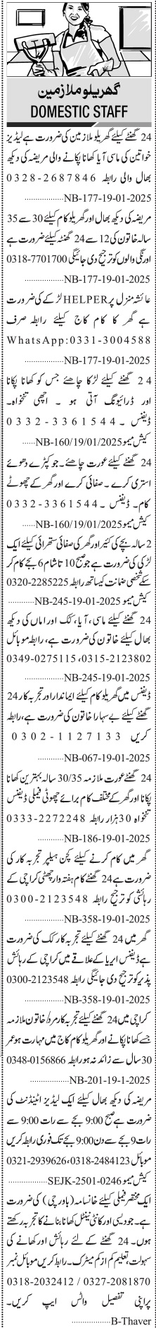 Jang Sunday Classified Ads 19 Jan 2025 for House Staff