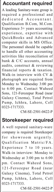 Waheed Sons is looking for candidates for following posts as per job advertisement published in daily Jang Newspaper of January 20, 2025 for location Lahore, lahore Punjab Pakistan: