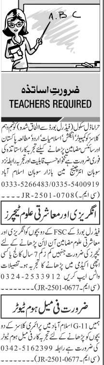 Private School Islamabad, islamabad Islamabad Pakistan invites applications from eligible candidates for the post of science teacher, primary teacher, english teacher, urdu teacher, computer teacher, social studies teacher, female teacher, pak studies teacher, islamiat teacher, teacher and home tutor as per advertisement of January 20, 2025 published in daily Jang Newspaper. Preferred Education is BA, M.sc, MA, Master and Bachelor etc.